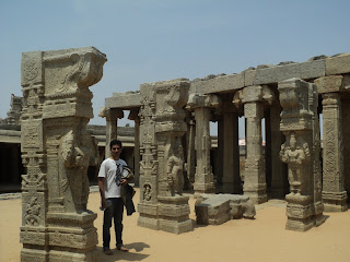 3. Hanging Pillar: Oh yeah this is my favourite feature of this temple. It is a suspended column hanging down from the ceiling. The pillar is literally hanging from the roof (Eg for a Cantilever, haha Proud Mech Engineer). We did spread a kerchief below it, just to check :P. Back in the days the Britishers did try to study it, when they tried re-positioning this pillar; all the pillars within the temple re-aligned themselves. Fearing the collapse of the structure they left it on its own. (Our ancestors totally owned the subject called mysterious engineering)