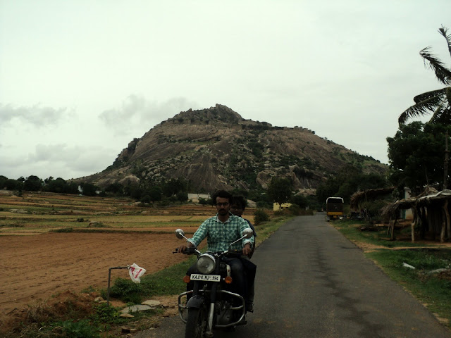 Okay with our tummies at peace, we came outside holding the tea cups. We caught up on each other’s lives and its own progresses. After the tea we left the hotel. As the sun was up, the ride was a little tiring, but soon we entered the country roads post Dobbaspete. The road conditions weren’t that good, but nevertheless we rode on at a decent pace until Koratagere. Going further about 15-20kms we could spot our hillock – The mighty Channarayandurga.