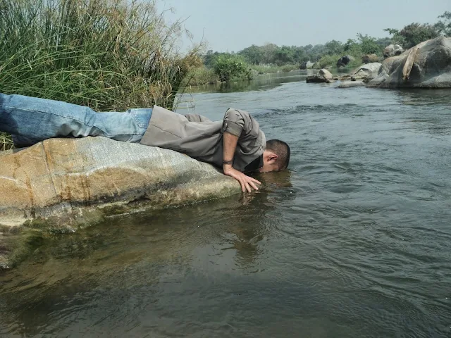 Oh yeah I even tried the new face washing technique or rather refreshing exercise, which Manju told me, he always does back in his home town. I laid down on my chest and gently dipped my face into the cold flowing waters. Trust me, that felt really, I mean really refreshing. After sleeping into the water for a twice or thrice, I felt energized and asked Manju who pretty much lost in the beauty of the flowing river that we hit back the road.