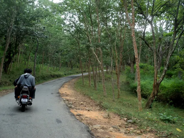 The ride after that was pretty much smooth and straight forward. We reached the T-Junction at Mallavali in a short time where we pulled over for some tea. Then we carried on and reached Gaganchukki, when asked for a call about the visit to the place, we decided to head further.  We reached kollegala and wading through the streets we quickly exited the town and entered the shortest route which shot right at the base of BR hills. The ride along the countryside was something fantastic and something we really did enjoy. We had one final stop after having got the glimpse of the mighty ranges from afar, after which we reached the base ready to sink into the cool darkness of the forest.