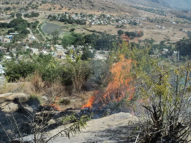 The trek back took us about 45mins. The steep stretches were covered in quick time. After reaching the 2nd stretch which consisted of tall dried up grass, we smelt smoke. Then the sight in front of shook us slightly, even though it got us excited in equal manner. It was a wild fire (the 2nd one we’ve encountered after Savandurga in 2010) . We waded through the burning grass keeping the direction of the wind in mind. (Although the easier and advisable solution was to climb back and wait for the fire to die with the wind)
