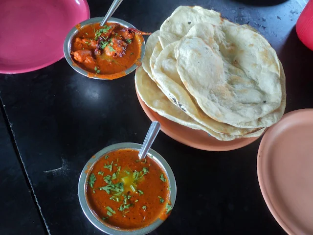 We rode back at a slow pace on the country roads as the ambience was much cooler. Once we reached the highway we kept up a decent pace until our tummies started swearing at us. So we pulled over at a dhaba on the highway itself.