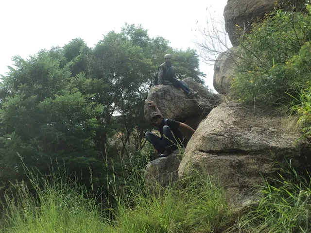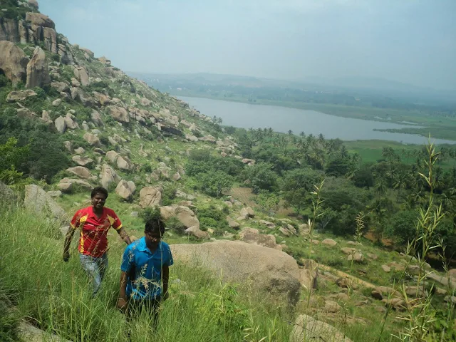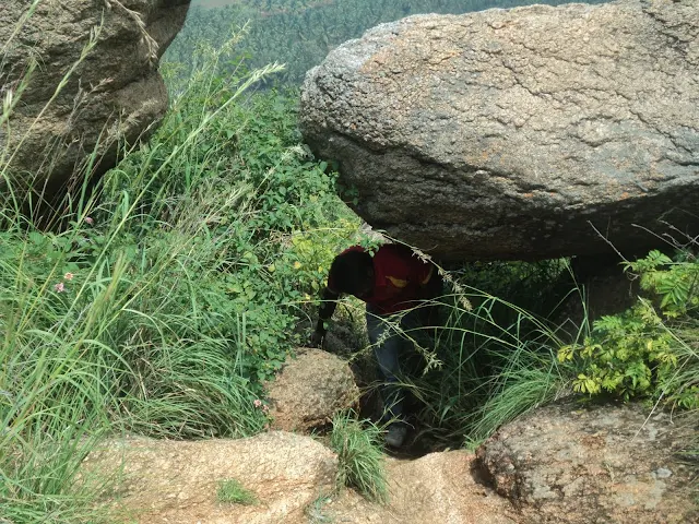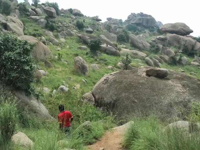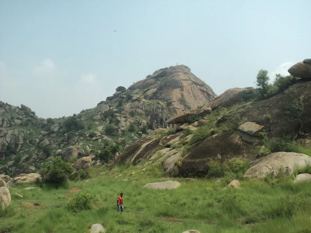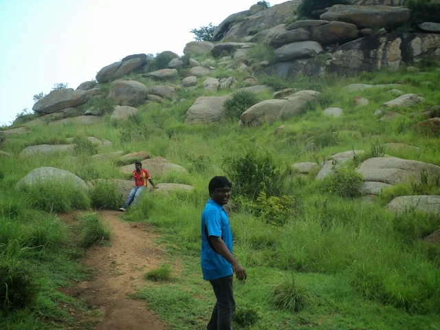 The problem with that was, we had to descend the first small hillock into flat lands and then climb up the second one. So we found ourselves in a cave kind of place, where we rested for few minutes and then  we were figuring out the way down. Deefu & myself kind of started jumping down the boulders like knights on a chess board, Ashok joined us shortly. Madhu went round about and made to the wastelands faster taking the roundabout but the less risky route. At the wastelands we spotted the pathway immediately and we were well on our way.