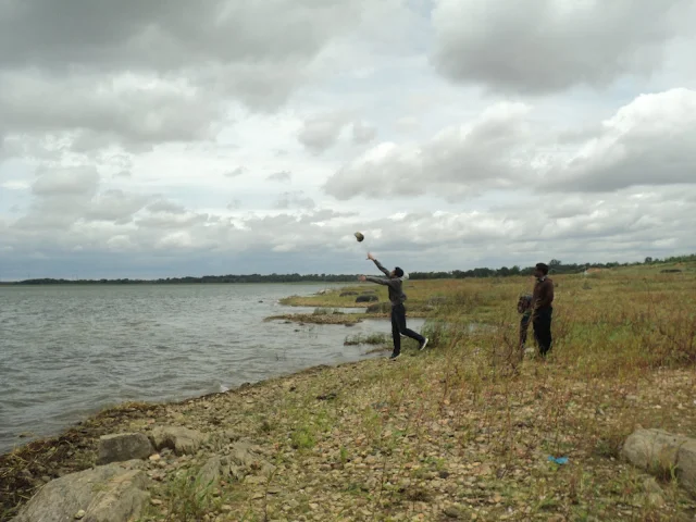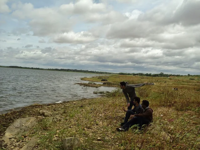 After walking back, we entered the fields and walked to the shores of the reservoir. The winds were pretty crazy trust me. The waters kept crashing on the stones and we just stood there enjoying it. Okay, after letting go our bags and jackets we sat on the shore for some time enjoying the breeze the sight of the waters. After which the games began!