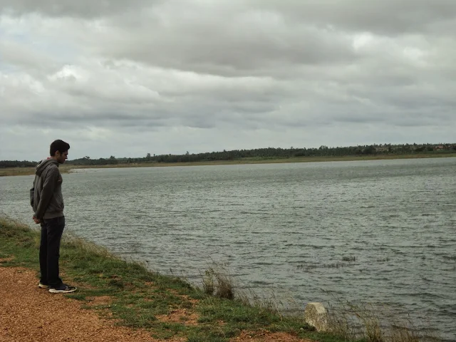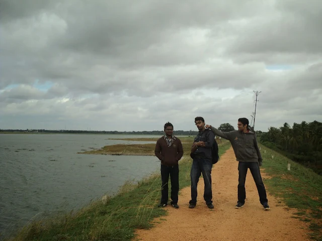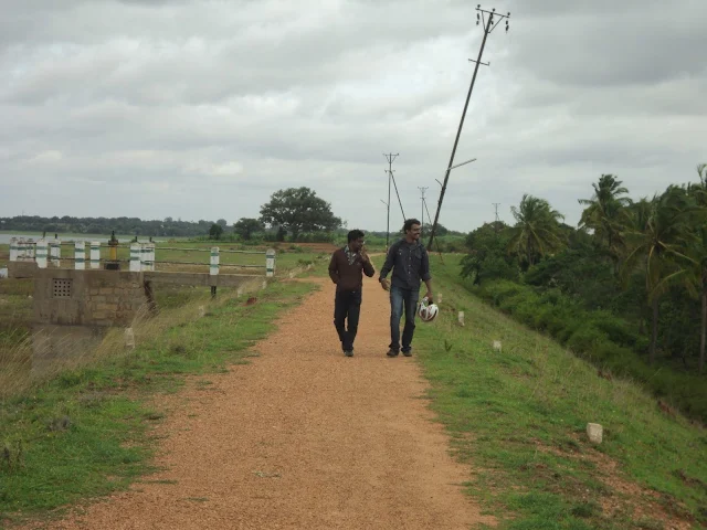 First things first, found a nice cool place to park our bikes. Only after which, we decided to take a stroll on the bunds of the reservoir. We fooled around a lot these bunds,. The waters of the reservoir were sparkling and the winds were blowing with some good force. Wed did walk until the dam gates, but decided to return to the shore and play a few games. But trust me, if you do go this place I would recommend you guys to take a dam tour and see the construction from inside, it’s totally worth it. (And if you just want to read though what is there here’s the link – Markonahalli Fog Ride)