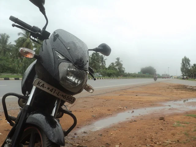 After spending 1.5 hrs drinking & munching nicely, we left the dhaba afloat. As soon as we left the curtains of the sky opened and down came the rain. We were so happy, even though it was pouring we just go on our bikes and started riding slowly enjoying the rains. After reaching Nelamaganla, we took a break for some hot tea.
