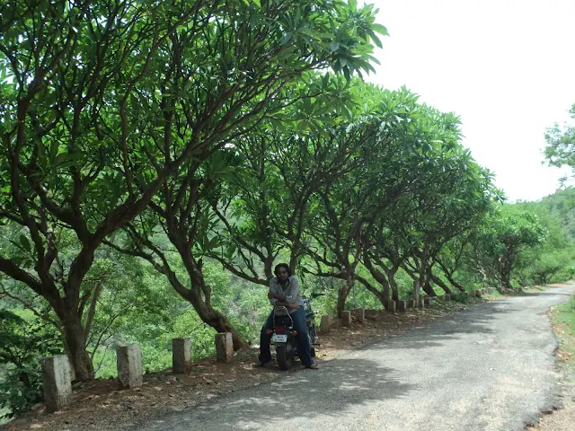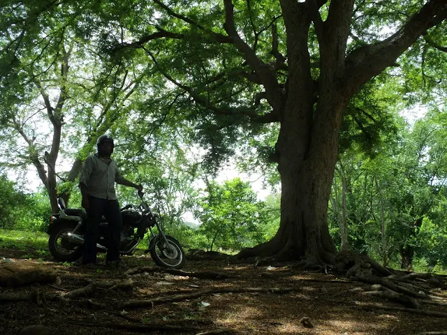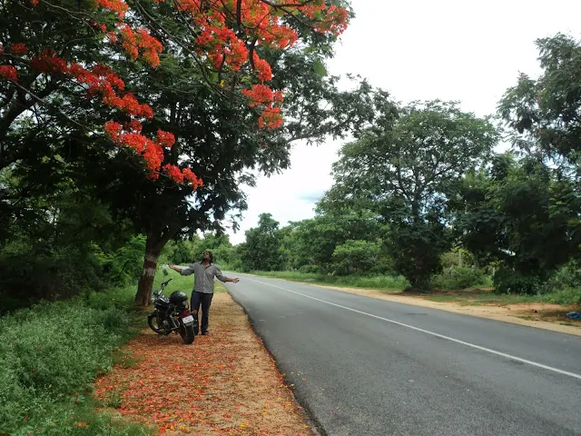 This was a 100kms ride back to Bangalore. But this time we decided to take the kanakpura road as it was noon and the roads were much better. So left Muthati at about 12:30 and we made sure we stopped at the tree stretch as we would like to call it for taking some photographs. After which we rode back the checkpost and told the officers “first improve roads saaar” ! We continued towards Kanakpura. The roads were super smooth but with the sun up the temperatures had shot up.