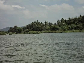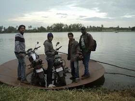 So, what do we do? We change the plan to Talkad itself, or go off to Somanathpura? Everybody were confused. We rode on towards Talakadu for some kilometres after which we spotted a few fisherman standing on the roadside. We asked if they could take us across the river. He agreed gladly, 40rs/bike & 20rs/person. We agreed gladly to as the experience would be something off the road and hopefully not off the boat :P. Riding in the interior mud roads of a village we ended up on the river banks. Finally we found quite a few coracles pretty huge ones made of metal resting on the banks. They asked us to get our bikes onto the coracle and off we went. Rowing slowly across the river. Madhu got a call from one of his friend the conversion went something like this: