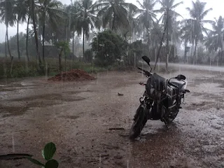 As we left Mahadevpura, our bodies were tired. Dark clouds had begun to cover the sky. As said earlier lot of turns from the highway we had taken to reach the place. So if we would miss any of these it would be a new route altogether. Dany & Madhu raced ahead, but Dilip & me went on shouting, speaking non-stop. We were constantly engaged in a conversation and missed a crucial turn. We realized we had missed a turn, but patted ourselves saying all roads will reach the highway and we had all the time (Bad Move!:P). But the road kept going on and down came the mother of all rains. it started pouring cats out of nowhere and we ran into a “Aale mane” (cane sugar processing) Ah, it felt good, standing in the shelter in that heavy rain.