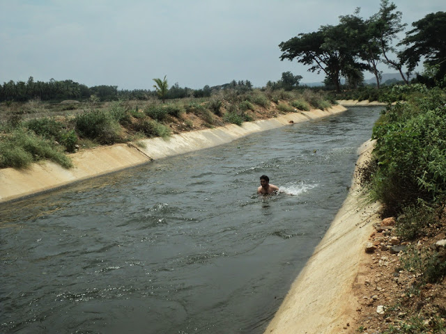 The weather was good, the air was clean, water looked sparkly fresh, lots of birds here and there. Looked just perfect! We walked in between the canal and the river for sometime. wondering whether to get down or no. Then Dilip said he would push all of us inside the river if we refused:P And first he got into the canal and tried all sorts things. Caught a crab, slipped into the gushing waters and was dragged off by the force of waters, finally we pulled him out. Took our bikes to a decent place, put all our belongings into our bikes and off we went through the river.