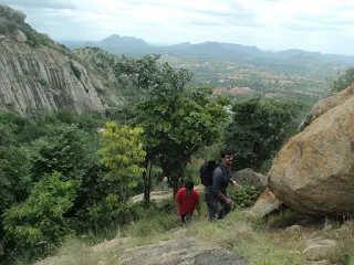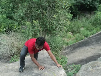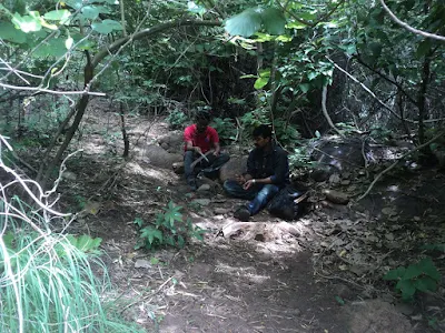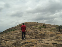 At one point, I remember, at a steep face, I slipped and went on slipping down the rock face. But finally was able to get back the grip and ended hard on my bum. In about 20mins we made it to the base of the hillock. We were dead tired and damn hungry. So without any delay we had one last look at the hillock and took off.