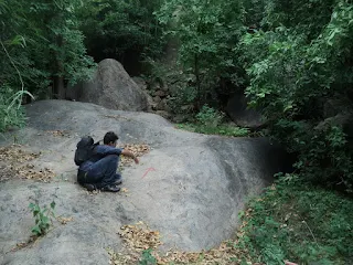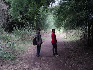 As we parked our bikes and started walking into the thick forest, we were stopped by a couple of men claiming to be forest guards and told the premises was not allowed to visitors. We asked them to display their ID’s so that we could put an effort to obey them. Immediately they said we could carried on :P After which the temperatures dropped considerably as the greenery deepened. We found trees with lot of rituals carried out on them (man & his symbols, a big face palm).We found a very nice lake to rest, but trust me we were beginning to get worried by now. The forest had got pretty dense and the sounds of only insects and animals were beginning to creep us out. We were making extra sure not to step on a snake or surprise any bear or any other wild animals. It eventually got darker and quieter. There were huge anthills all around the place and few places we had crawl through the thorny shrubs and bushes to get across.