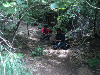 At one point, I remember, at a steep face, I slipped and went on slipping down the rock face. But finally was able to get back the grip and ended hard on my bum. In about 20mins we made it to the base of the hillock. We were dead tired and damn hungry. So without any delay we had one last look at the hillock and took off.