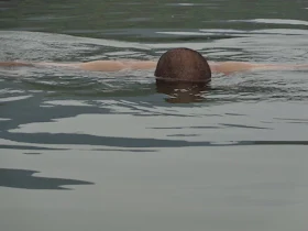 Ah, yes the placid river spot was just the perfect thing needed for us. The water levels had gone low, but nevertheless we had to watch out for the whirpools and dangers of this place. First I got in and swam for some time, after which Pradeep & Madhu got in as well. The float in the cool water was just the relaxation we needed. After about an hour playing in water we decided to get out dry ourselves and head back home. As we were heading out, i spotted a floating stone, I thought i was hallucinating and we packed. As we had a final look, it looked somewhat like a crocodile, but we dismissed and left. (Read the last part)