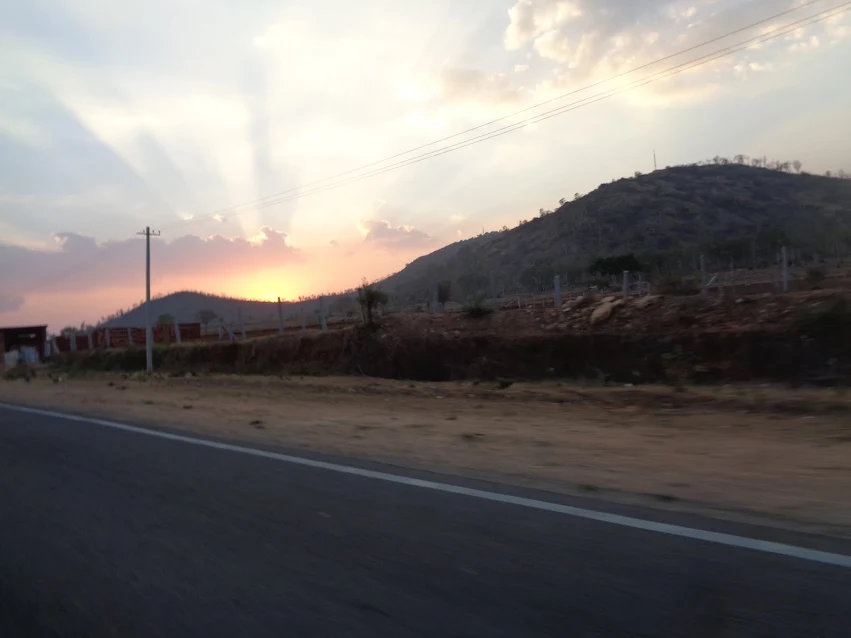 25-20kms from Mysore we pulled overat a very nice dhaba for some well-deserved food and kottu. We spent about an hour munching nicely on the lunch and finally we left the dhaba afloat. As we approached Mysore, the sun began his way down back to the horizon and the Chamundi in between us both made the scene spectacular.