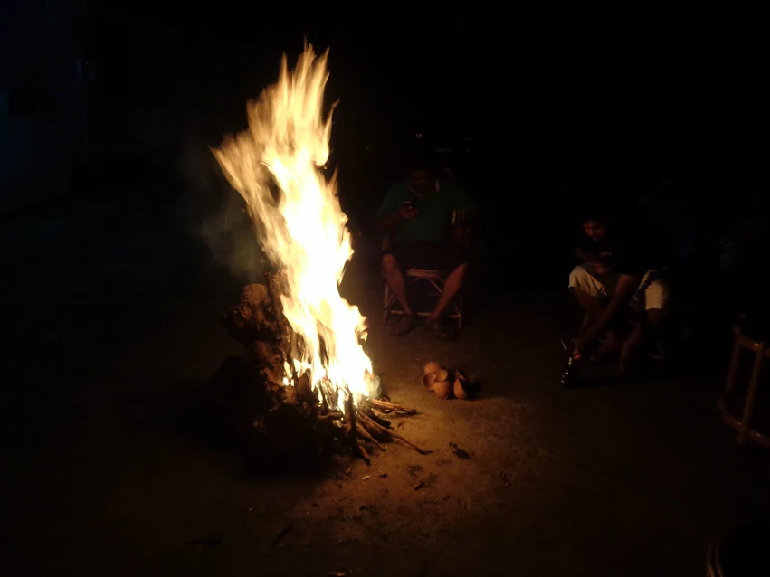 After tiring ourselves down to the last ounce of energy we decided to have bath and freshen up. Once we came down we helped our uncle to set up the camp fire and we had enough wood to keep it going for 3-4hours. We saved the good'ol monk for day two and it was a good decision. Placing the chairs and a table around the camp fire we began to drift away it observing the fire dance alongside the wind. Awesome fish fry, omlets, and chicken dishes kept coming and we down munching non-stop. (by the way had made one fat cat my good friend it was happily sitting beside us munching down on the fish and omlets, meow!)