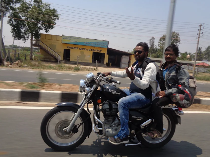 After the breakfast we rode more or less non-stop until Mysore with only one tea break in between. At the Mysore, we stood wondering how to proceed from there. We pulled over at the signal and turned towards Dilip’s bike to see if he would ask for directions. Once we approached him we realised he was asking for a kottu shop hehe! Okay we pulled over at a juice shop and loaded even more into our bags, bought some water and soft drinks as well and the headed out of Mysore.