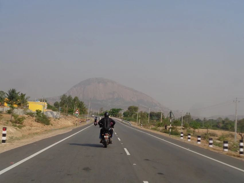 After munching down we had some light coffee and took off towards Dobabspete. On reaching the town, we took a right deviation and proceeded towards Madhugiri. This road is good no doubt, but has a lot of speed breakers. With Deefu’s Enfield this offered no resistance. However we did witness a fatal accident just happened then, a person was lying on the road with blood flowing out of ears, nose, and all over face. He was dead and trust me it was a disturbing scene. On our way to Madhugiri, we did say hi to other hillocks such as Mandharagiri, Siddarabetta & Channarayandurga. On reaching Madhugiri, we proceeded towards Pavagada. Thankfully this route had few speed breakers but the very fact of getting closer to Andhra could be felt. Barren but beautiful landscape the dry hot winds blowing onto our faces were clearly evident.