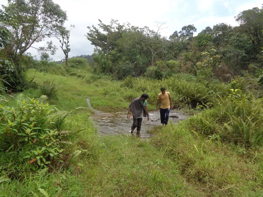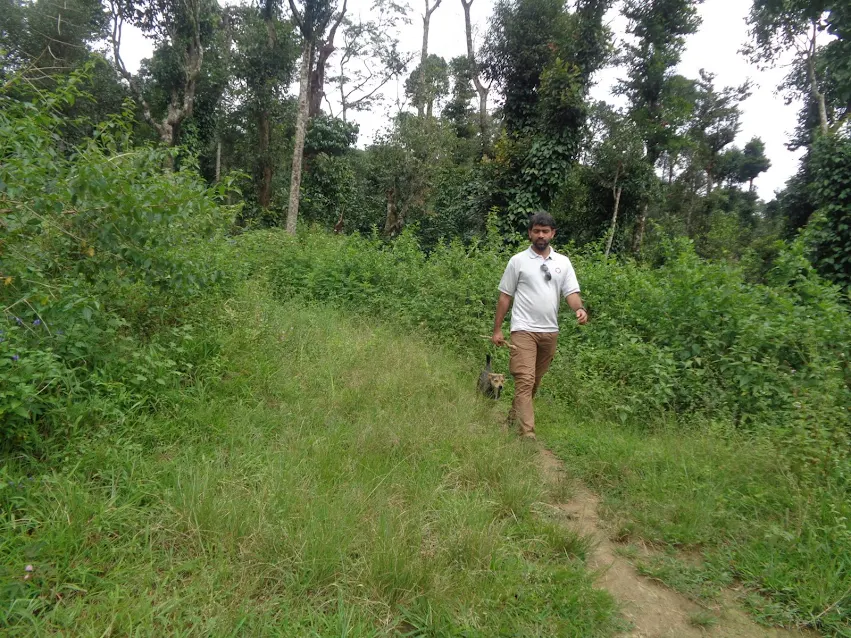 As we left the estate, we tucked our pants into our socks applied the leech repellent and began the walk through the plantations. Slowly the plantations faded and we found ourselves getting into thicker forest. We could spot a few streams and had to cross them.  The forest came on us dense, and as wild boars and elephants resided in them we were cautious in every step we took and with dogs ahead checking the way, we did our parts to ensure we were an awesome team.
