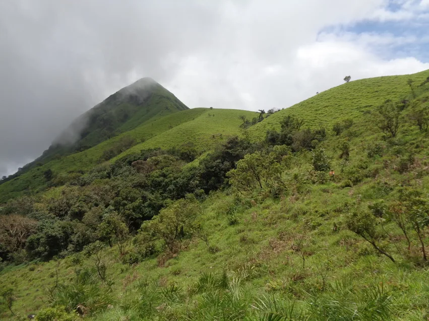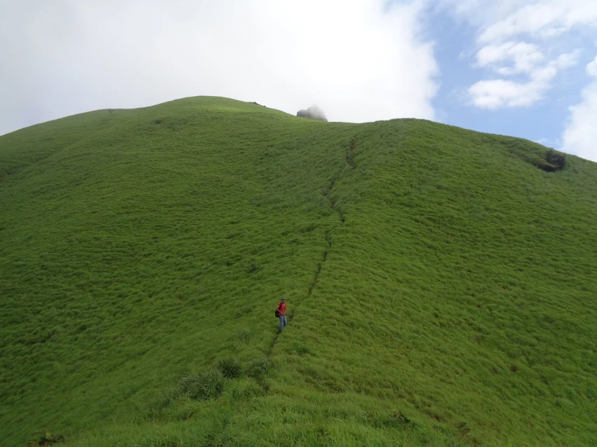 The forest left us into an open grassland were got a clear glimpse of the peak. Mist shrouded peak looked wonderful but sent mighty chills down our spines. Then we began a steep ascent holding tight onto the grass, the air was so fresh, I think I was high. The steep ascent in the grasslands helped us cover good ground in terms of altitude. We could see a beautiful waterfalls afar, a breath-taking scene it was.