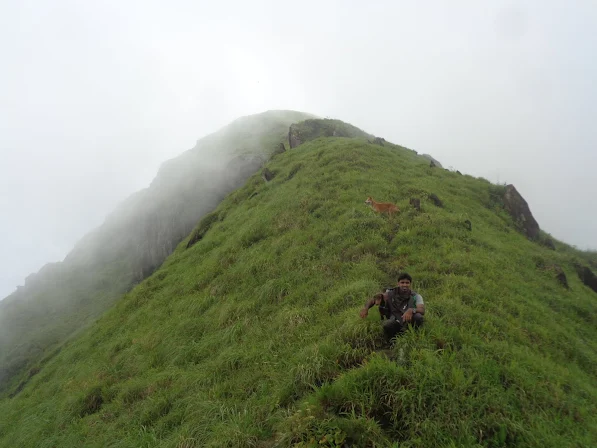 At the top, we sat down. It was a small footprint, there was a small nandi well buried into the earth. The dogs had little water at this point and we were surrounded with a blanket of mist and nothing was visible. The outline of Ethina Bhuja appeared for a few seconds before being swallowed up by the mighty fog. We realised it would be suicide if we stayed any longer at the place, we decided to venture to Deepadakallu from Jennukallu – peak to peak!